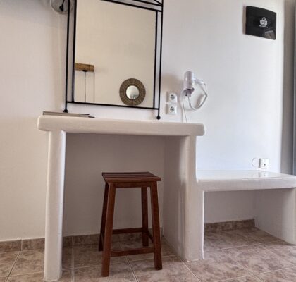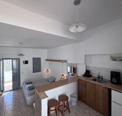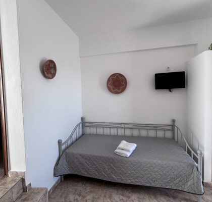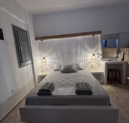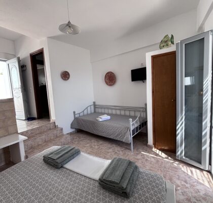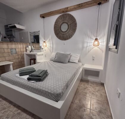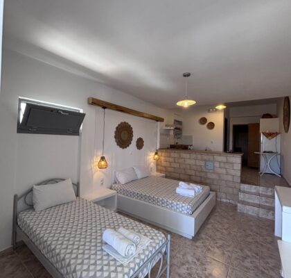 Νέα-ανακαινισμένα, ευρύχωρα και άνετα στούντιο διαμερίσματα δυναμικότητας 2-3 ατόμων, με υπέροχη βεράντα και θέα στην θάλασσα, με χτιστά έπιπλα και κρεβάτια είναι εξοπλισμένα με δωρεάν ασύρματη σύνδεση ίντερνετ (Wi-Fi) ηλεκτρικό βραστήρα, καφετιέρα, μικρό ηλεκτρικό κουζινάκι, στεγνωτήρα μαλλιών, τηλεόραση, κλιματισμό και μικρή θυρίδα ασφαλείας.